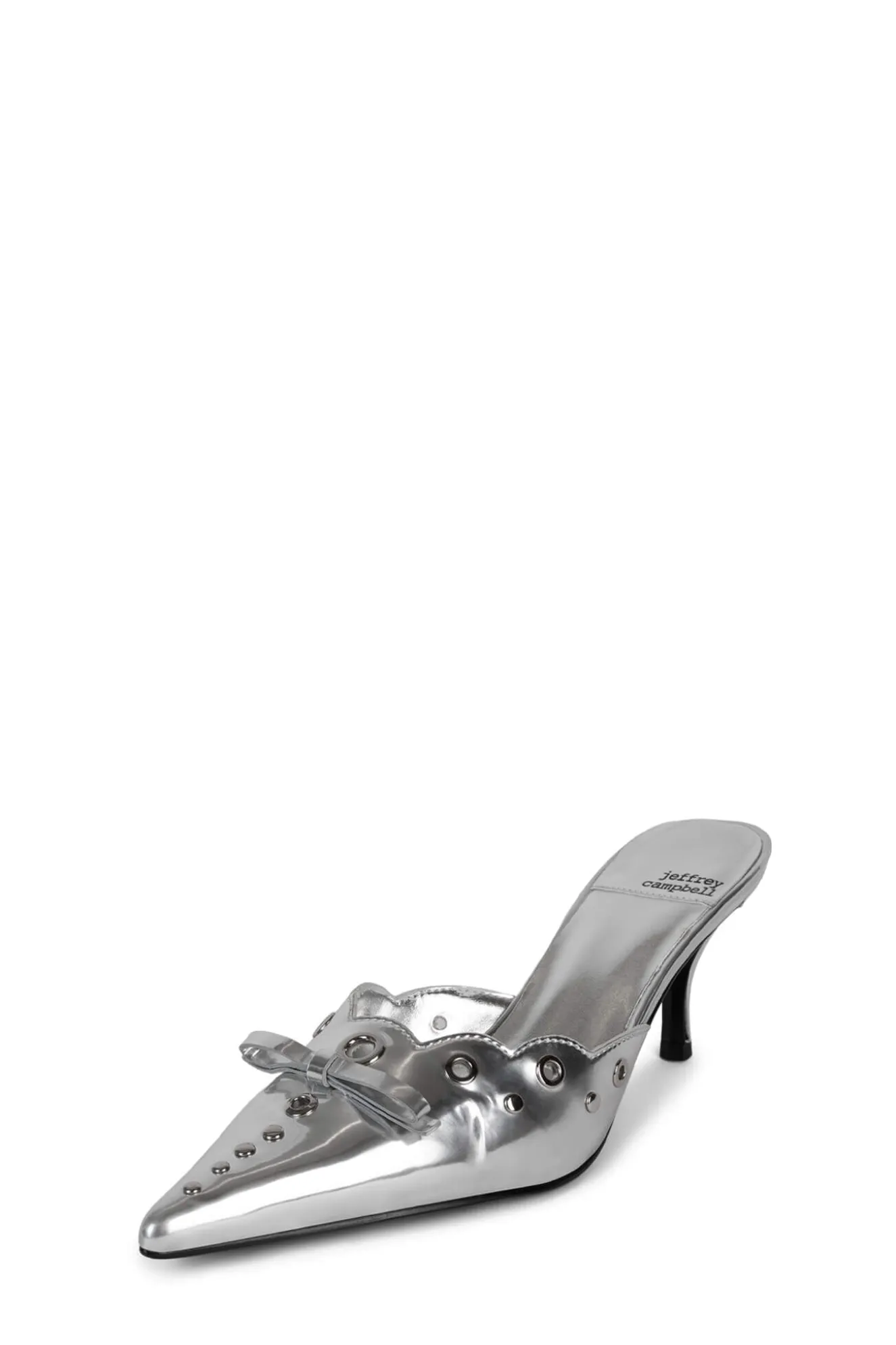 Pointed-toe kitten heel mule with eyelet and bow detail