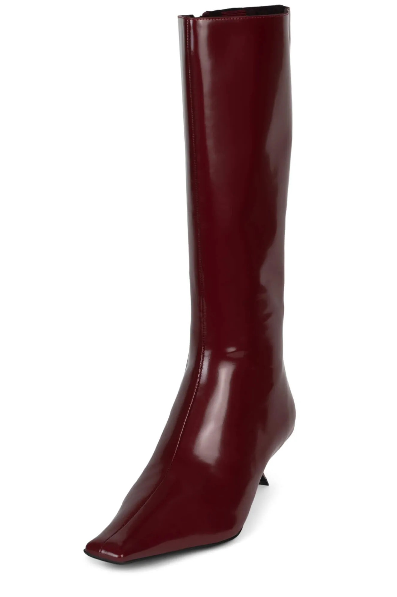 Elongated square-toe knee-high sculpted kitten-heel boot