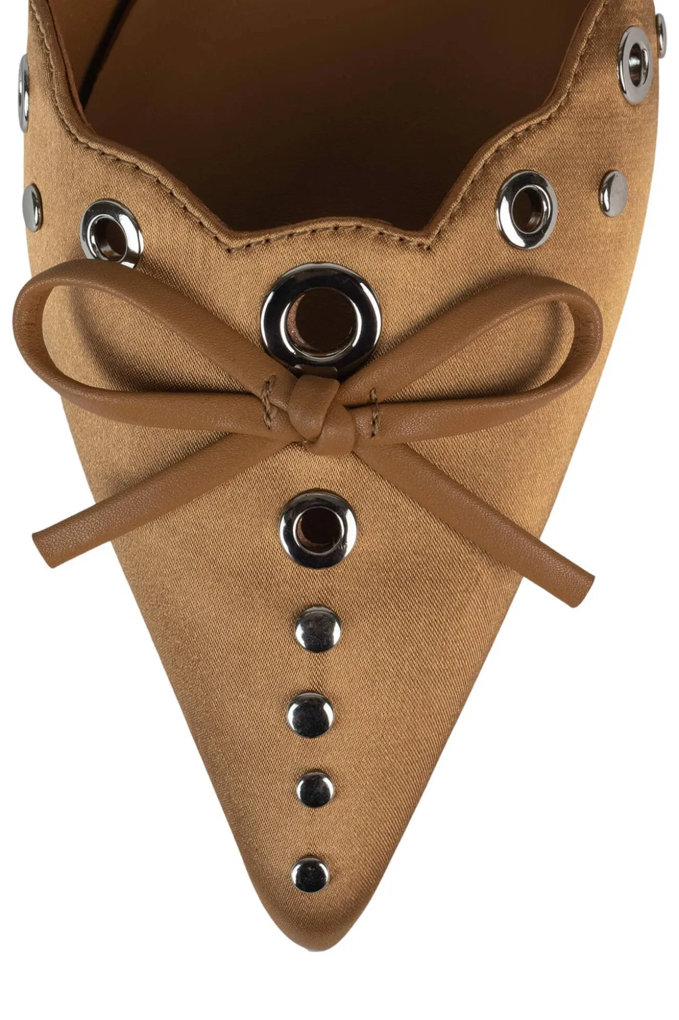 Pointed-toe kitten heel pump with eyelet and bow detail