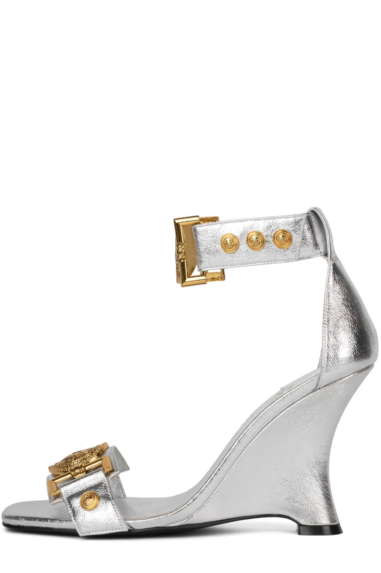Sculpted wedge sandal with ankle strap and lion emblem details